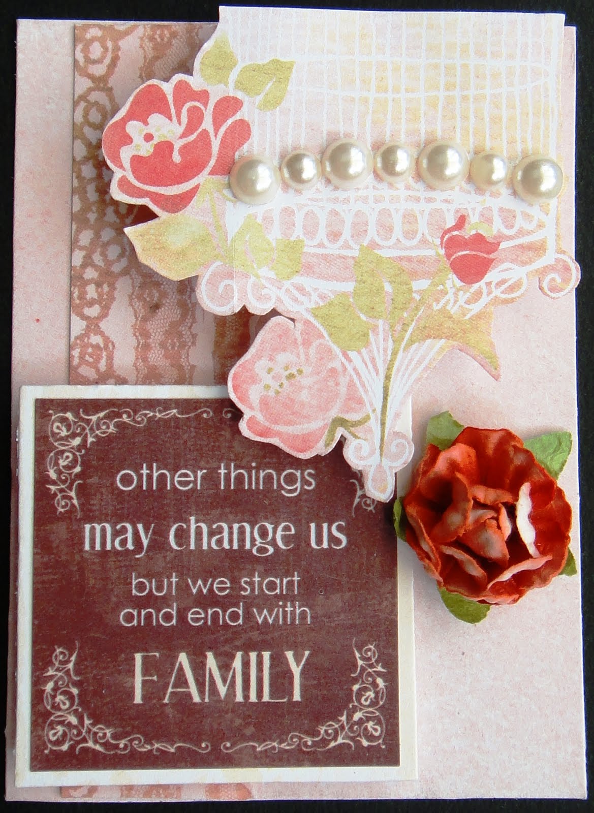 I interspersed our family photos with little ATC-sized layouts using cut-outs from the BG papers, popped up with 3D dots and embellished with pearls, blings, flowers and laces.